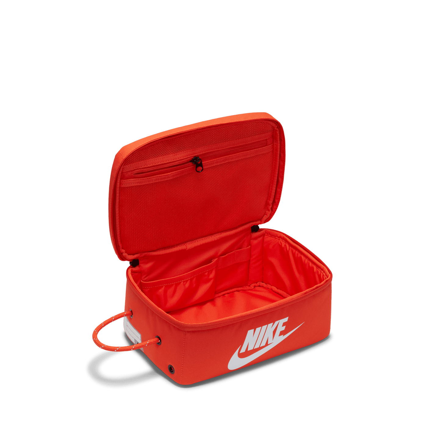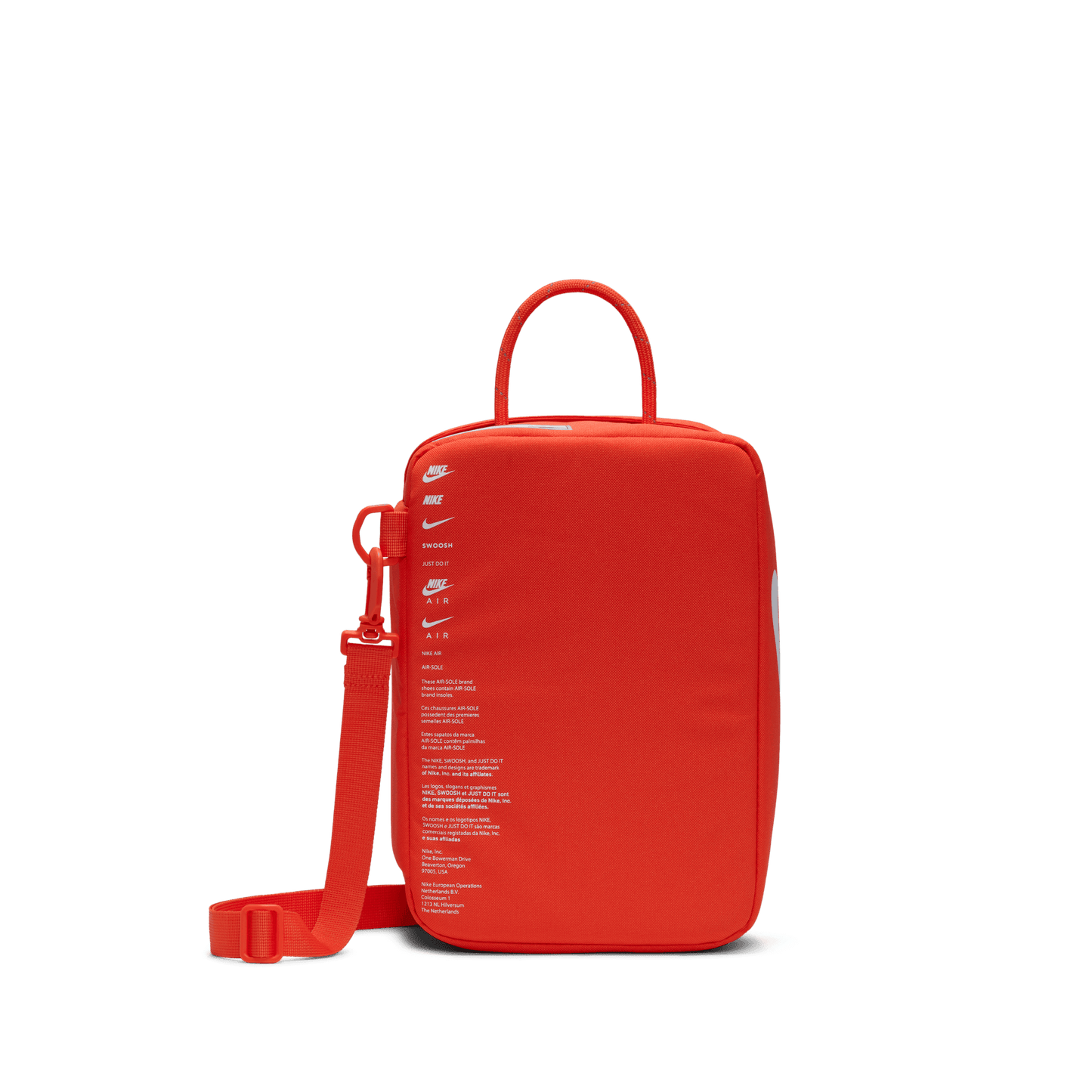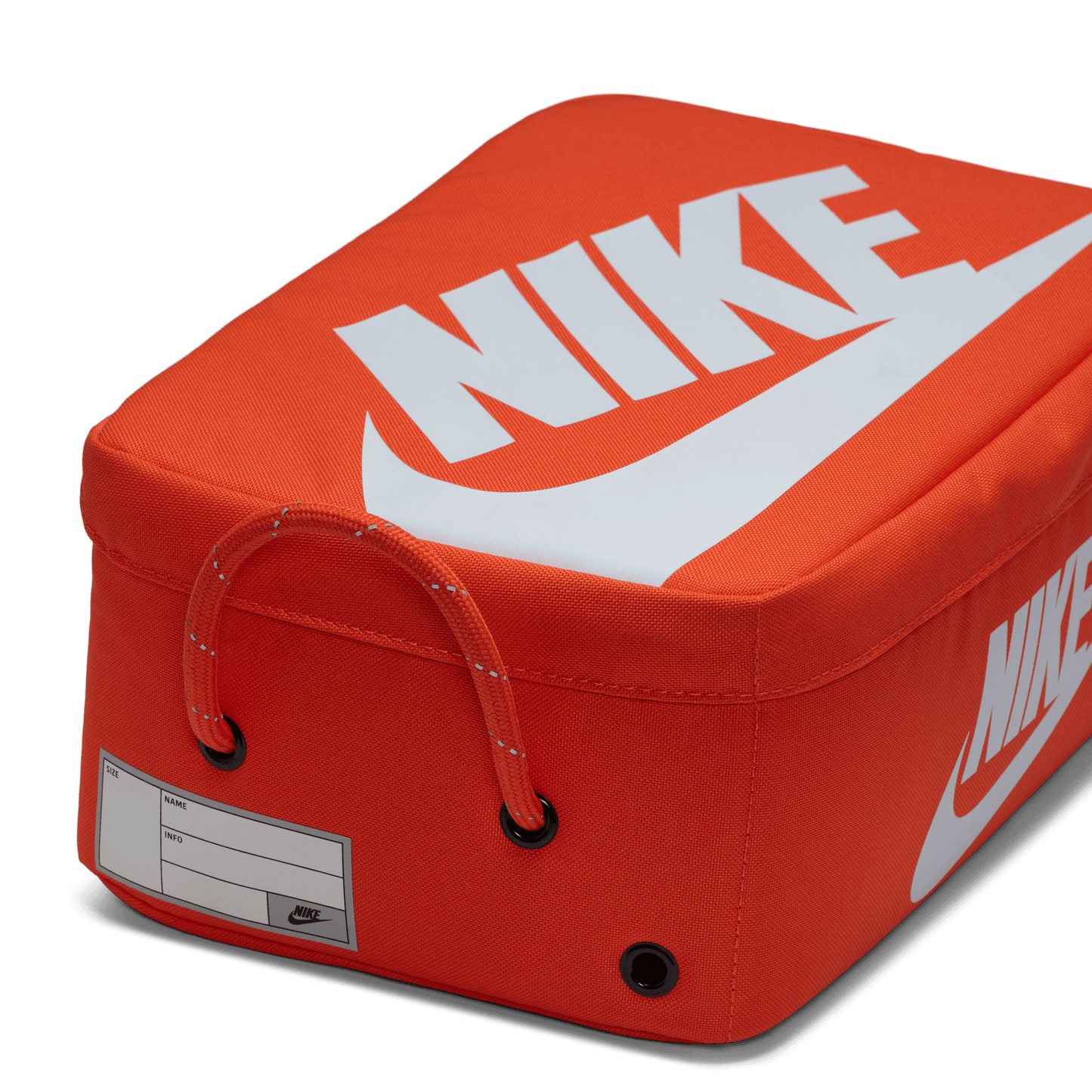 No arrojes tus zapatos en una bolsa de lona y te vayas. Esta bolsa tiene espacio para guardar calcetines, accesorios y cordones adicionales, y parece una caja Nike clásica. Una correa ajustable se combina con un asa de cuerda para que sea fácil de llevar.