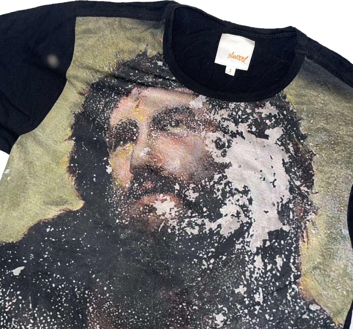 Con un original diseño inspirado en la pintura "Ecce Homo" previo a su curiosa restauración, la playera Elwood es ideal para aquellos que buscan un look único. Está hecha con una suave y resistente mezcla de algodón y poliéster, en una base de color negro.
