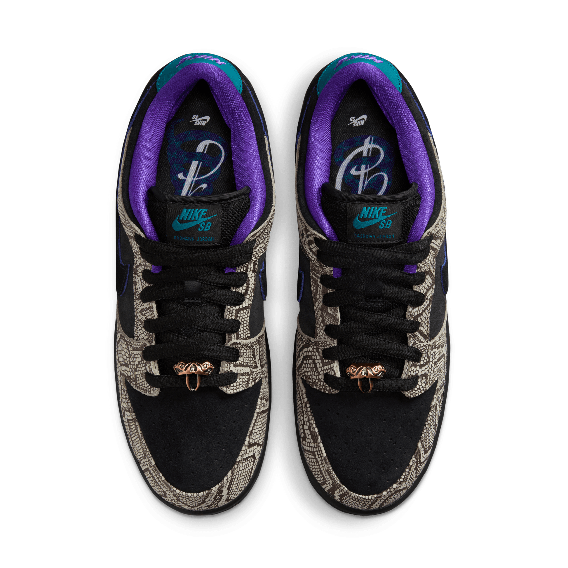 Dashawn Jordan transmite energía cada vez que se sube a la tabla, y lo hace con las Dunks. Esta vez, le da un toque local a sus zapatillas de skate favoritas con texturas y colores inspirados en el suroeste. La parte superior de piel de serpiente sintética evoca las serpientes de cascabel de Phoenix, realzadas por tonos turquesa y morado intenso en la lengüeta y el talón. Las dubraes de cobre con colmillos le dan el toque final.